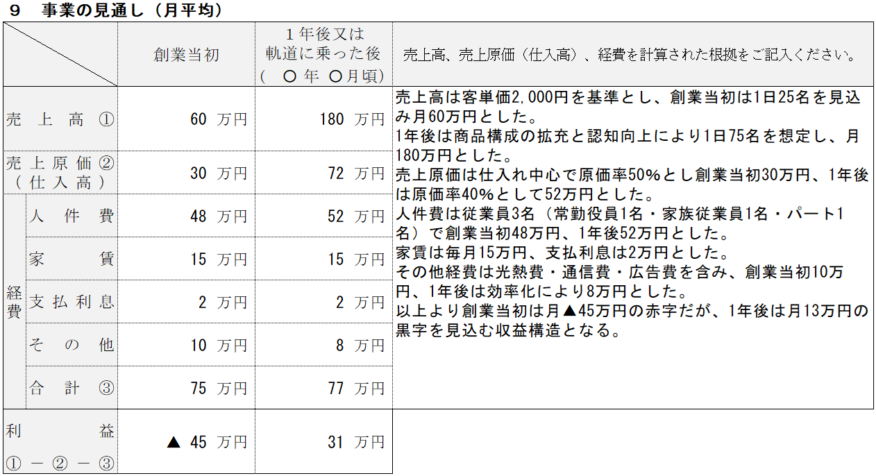 | ⑨事業の見通し | 創業当初から1年後(または事業が軌道に乗った後)の財務計画を、算出根拠と合わせて整理します。 | ||