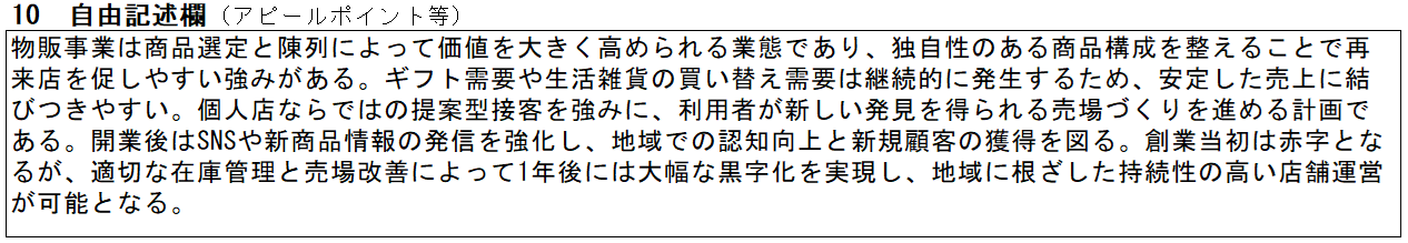 | ⑩自由記述欄 | 他項目では表現できていない事業のアピールポイントを整理します。 | ||