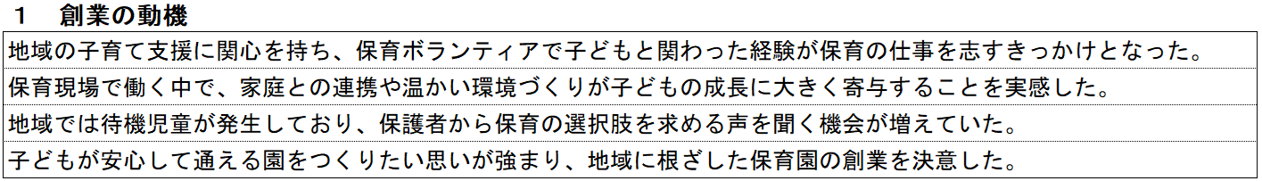 創業の動機では、子どもが好き、地域に貢献したいといった思いをそのまま書くだけではありません。重要なのは、数ある子育て支援の形の中で、なぜ保育園という事業形態を選んだのかを整理することです。