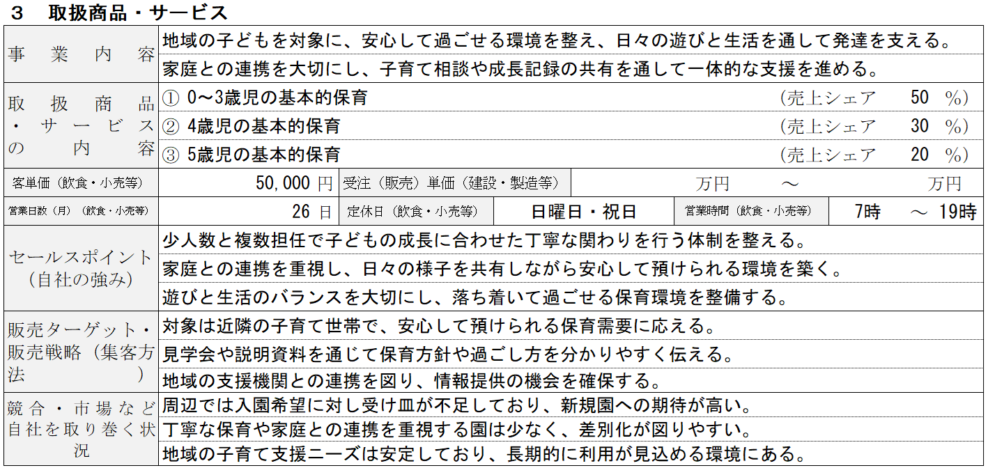 | ③取扱商品・サービス | どのような事業を行い、なぜその事業が成立するのかを、市場・競合・自社の差別化ポイントといった観点から整理します。 | ||
