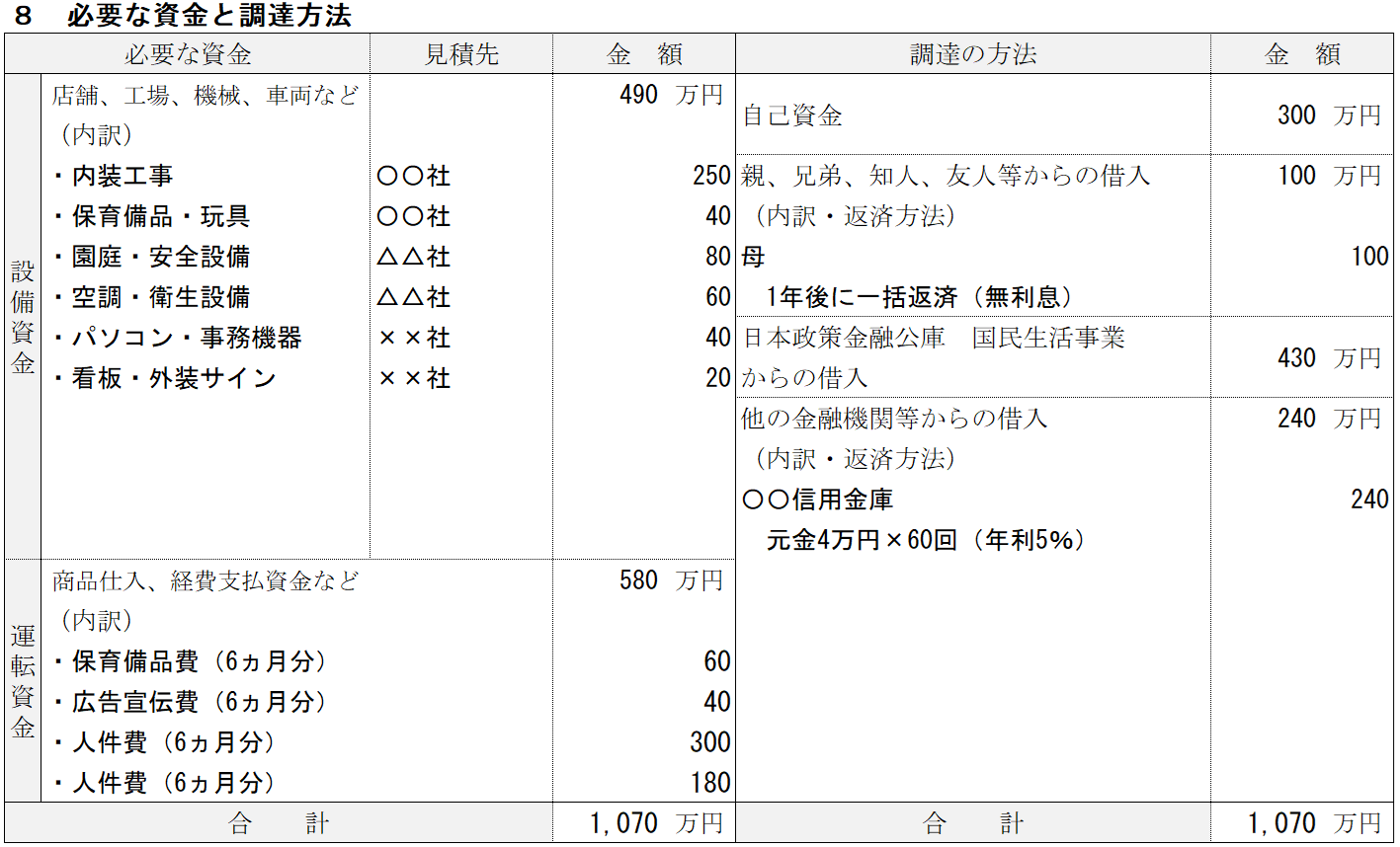 | ⑧必要な資金と調達方法 | 事業で必要になる設備資金と運転資金、そしてそれらをどのように調達するかを整理します。 | ||