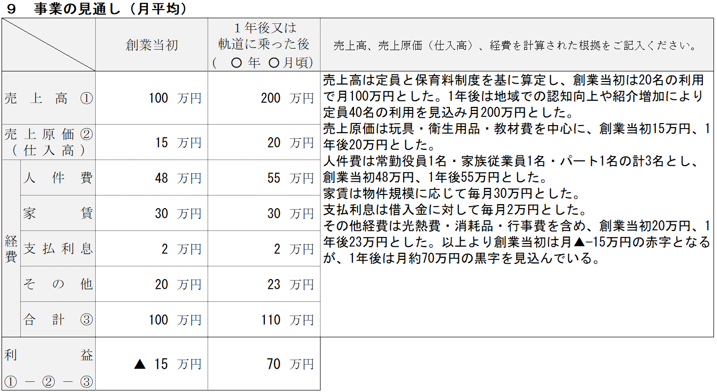 | ⑨事業の見通し | 創業当初から1年後(または事業が軌道に乗った後)の財務計画を、算出根拠と合わせて整理します。 | ||