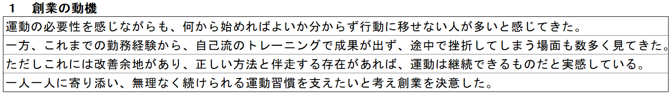 単に独立したいという理由にとどまらず、このパーソナルジムでなければ実現できない指導や関わり方があるという考え方を言語化することで、資料全体の各項目が自然につながります。