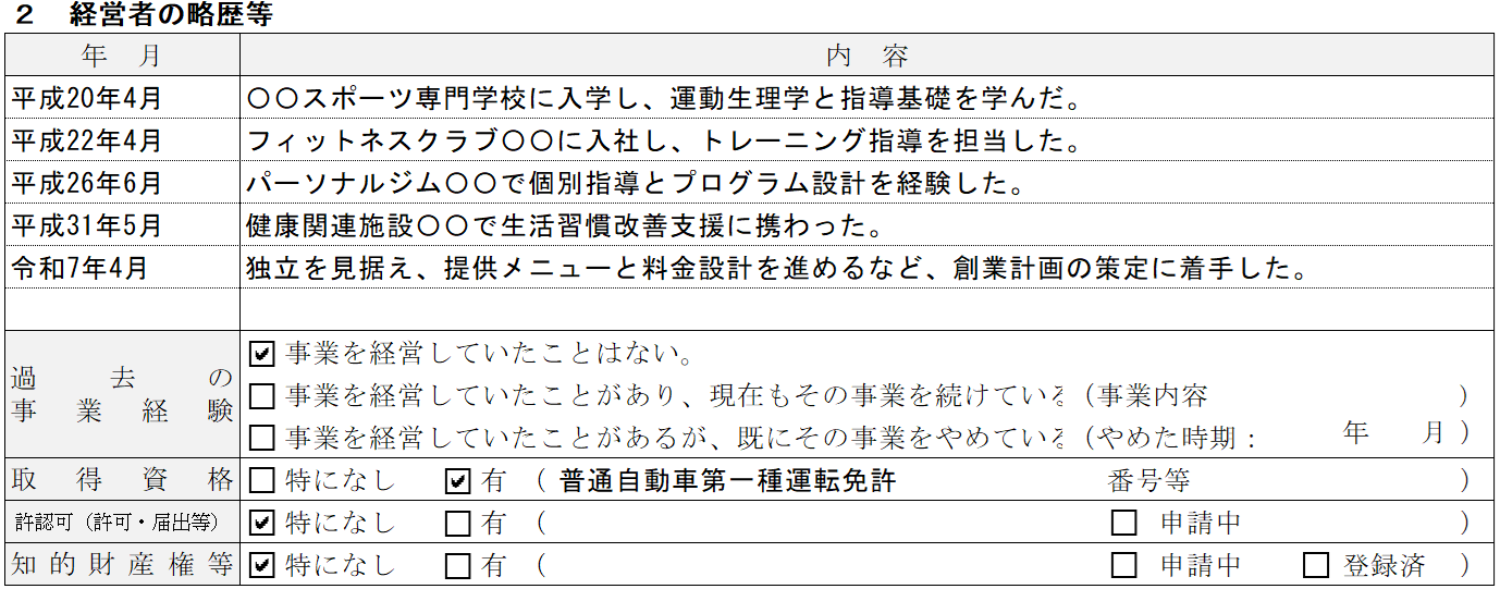 経営者の略歴では、トレーナーとしての経験年数や勤務先を並べるだけでなく、その経験がどのように今回のジム運営に活かされるのかを整理することが重要です。資格や研修歴、対応してきた顧客層などを振り返ることで、自分の強みが見えてきます。
