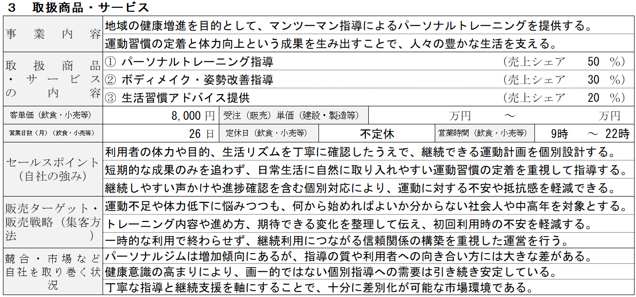 | ③取扱商品・サービス | どのような事業を行い、なぜその事業が成立するのかを、市場・競合・自社の差別化ポイントといった観点から整理します。 | ||