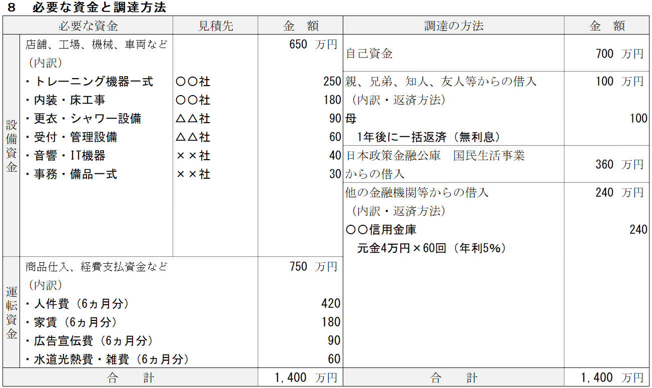 | ⑧必要な資金と調達方法 | 事業で必要になる設備資金と運転資金、そしてそれらをどのように調達するかを整理します。 | ||