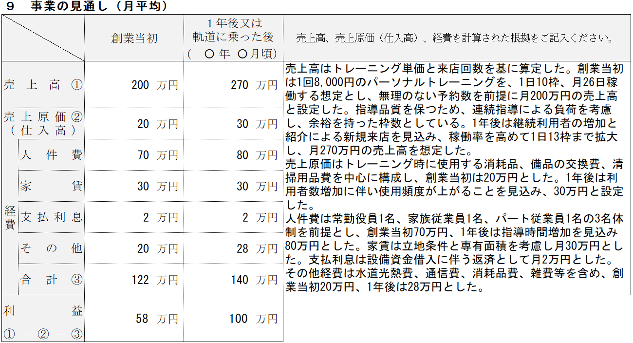 | ⑨事業の見通し | 創業当初から1年後(または事業が軌道に乗った後)の財務計画を、算出根拠と合わせて整理します。 | ||