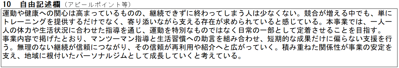自由記述欄では、パーソナルジムとして大切にしたい考え方や、指導に対する姿勢を整理します。ここでは、これまで整理してきた内容と矛盾がないよう意識することが重要です。