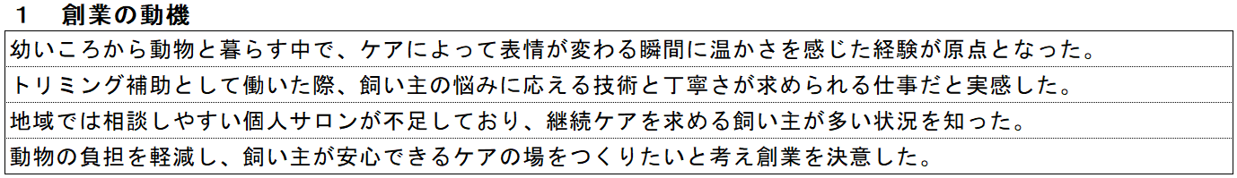 この項目では、なぜ自分がこのペットサロンを安定して運営できると考えているのか、その根拠が自然に伝わるよう整理することが大切です。