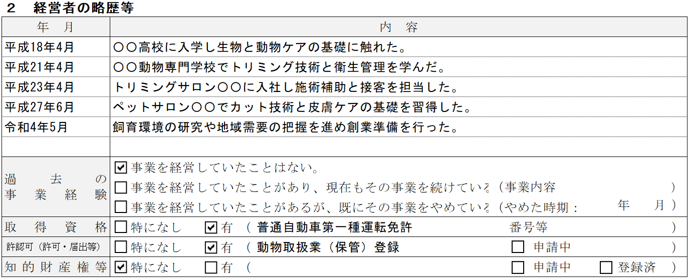ペットサロンの記入例② 経営者の略歴等