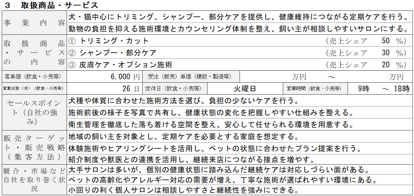 取扱商品・サービスでは、トリミングメニューを並べるのではなく、どのような価値を提供するペットサロンなのかを整理することが重要です。カットやシャンプーだけでなく、皮膚ケアや健康面への配慮、定期的なメンテナンスの位置づけを考える必要があります。