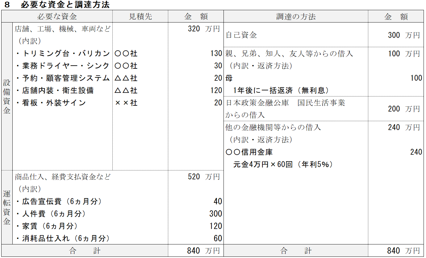 | ⑧必要な資金と調達方法 | 事業で必要になる設備資金と運転資金、そしてそれらをどのように調達するかを整理します。 | ||