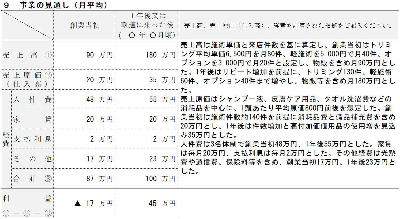 ペットサロンの記入例⑨ 事業の見通し