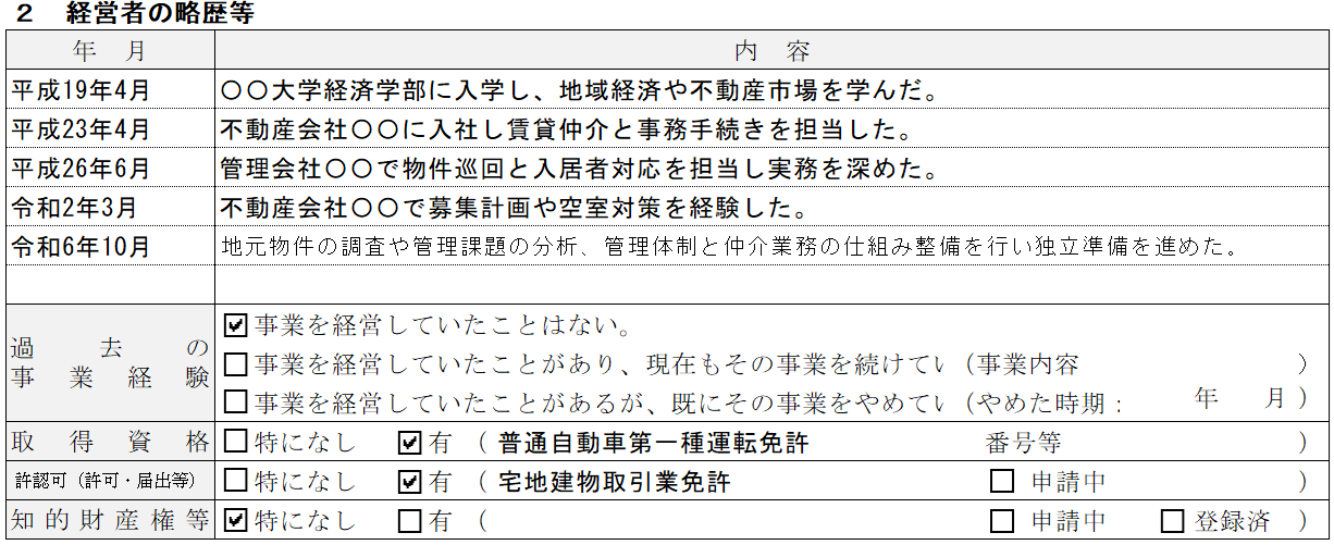 不動産管理・仲介の記入例② 経営者の略歴等