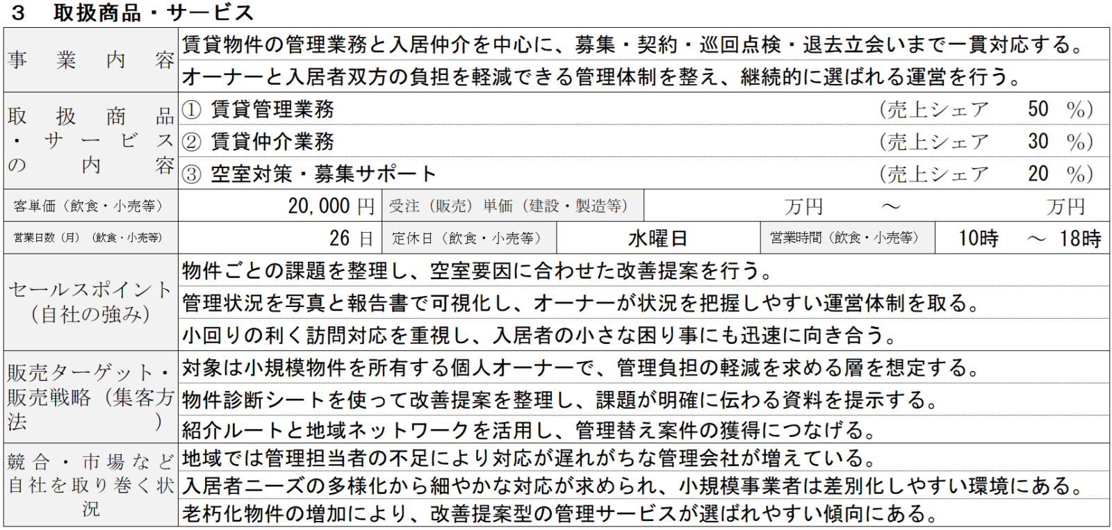 取扱商品・サービスでは、管理物件や仲介物件を列挙するのではなく、市場や競合を踏まえて自社が担う役割を整理します。