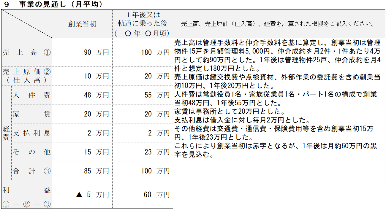 | ⑨事業の見通し | 創業当初から1年後(または事業が軌道に乗った後)の財務計画を、算出根拠と合わせて整理します。 | ||