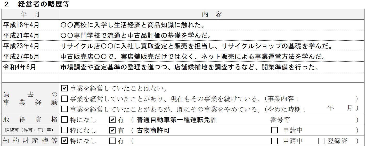 リサイクルショップの記入例② 経営者の略歴等