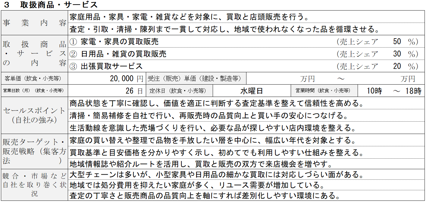 取扱商品・サービスでは、扱うジャンルを列挙するのではなく、なぜそのジャンルを選ぶのかを整理することが重要です。家電、衣類、雑貨、ブランド品など、それぞれで在庫回転や価格変動の特性は大きく異なります。