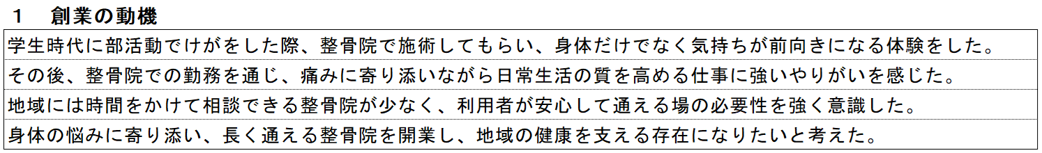 この項目で大切なのは、なぜ自分が施術だけでなく、経営の最終責任を引き受ける立場を選ぶのかを言語化することです。