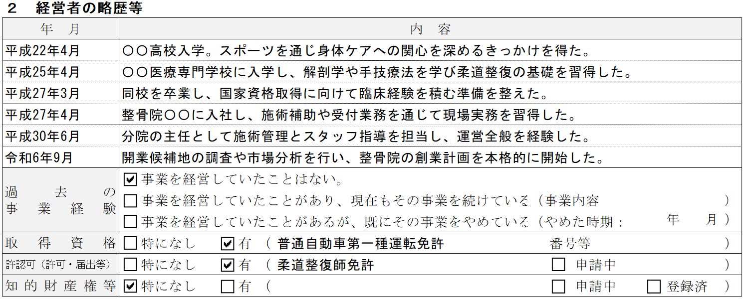 この項目は、自分自身の現在地を客観的に把握し、無理のない事業計画を組み立てるための前提条件を整理する場です。等身大の経歴を言葉にすることで、計画全体の現実性が高まります。