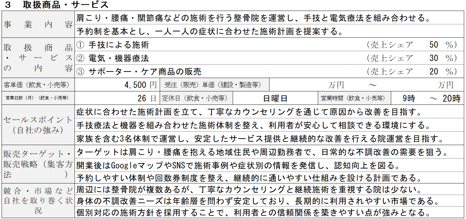 この項目では、施術メニューを列挙するだけで終わらせてはいけません。重要なのは、どのような悩みを持つ患者に、どのような価値を提供する整骨院なのかを明確にし、その設計が市場環境の中で成立すると説明できているかです。