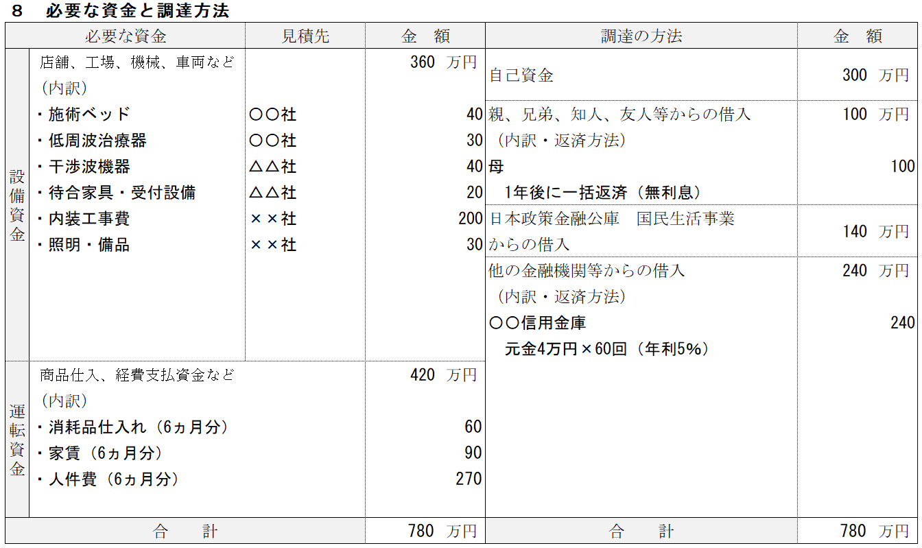 | ⑧必要な資金と調達方法 | 事業で必要になる設備資金と運転資金、そしてそれらをどのように調達するかを整理します。 | ||