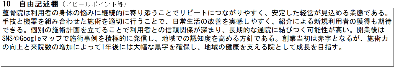 | ⑩自由記述欄 | 他項目では表現できていない事業のアピールポイントを整理します。 | ||
