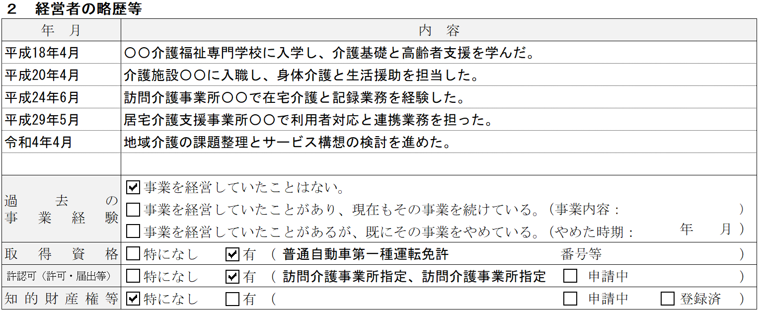 訪問介護の記入例② 経営者の略歴等