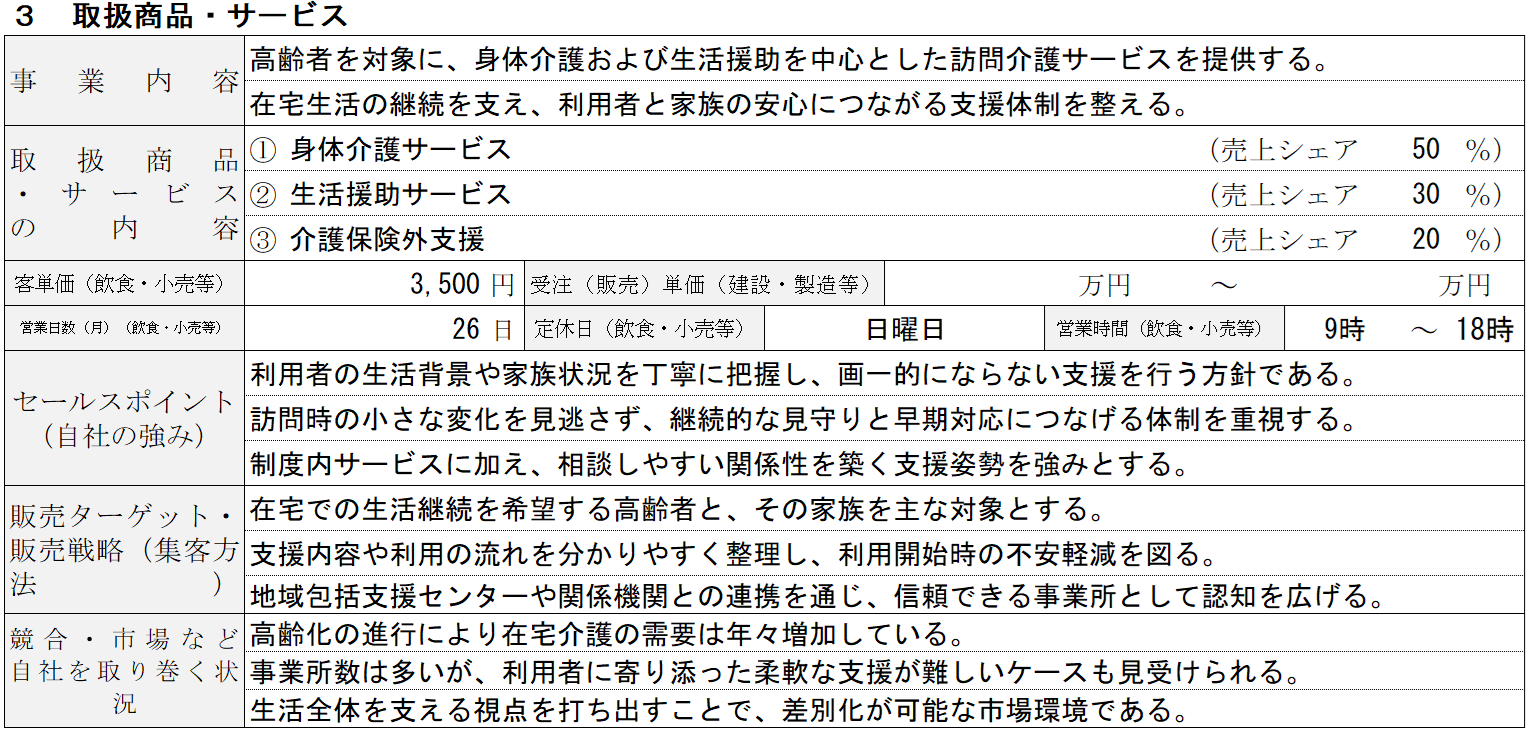 | ③取扱商品・サービス | どのような事業を行い、なぜその事業が成立するのかを、市場・競合・自社の差別化ポイントといった観点から整理します。 | ||