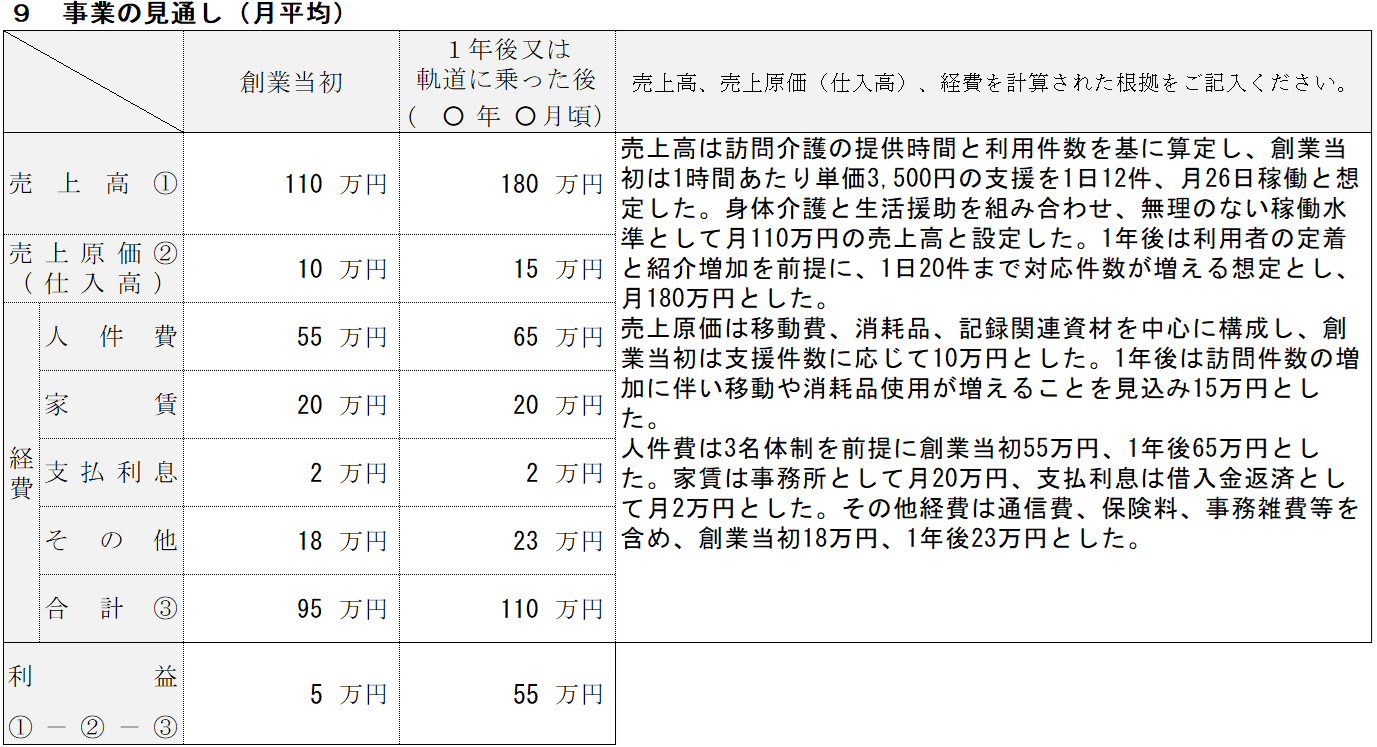 事業の見通しでは、売上や費用を洗い出し、訪問介護の収支構造を整理します。
