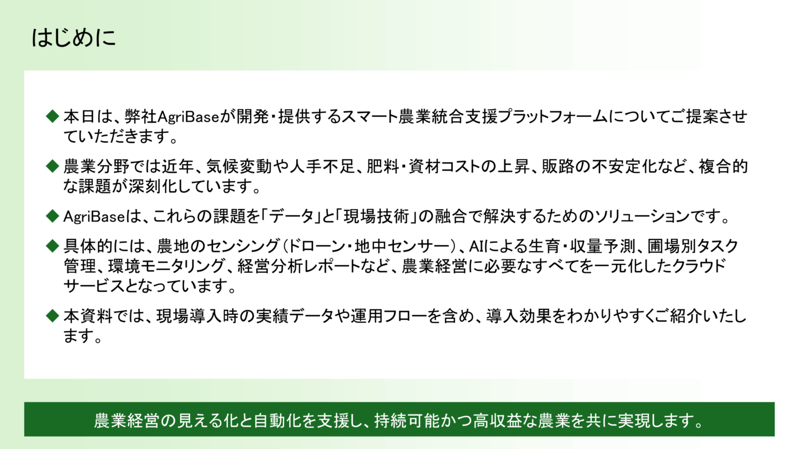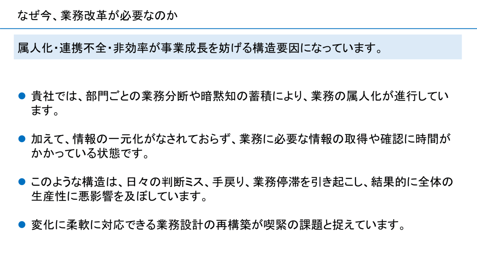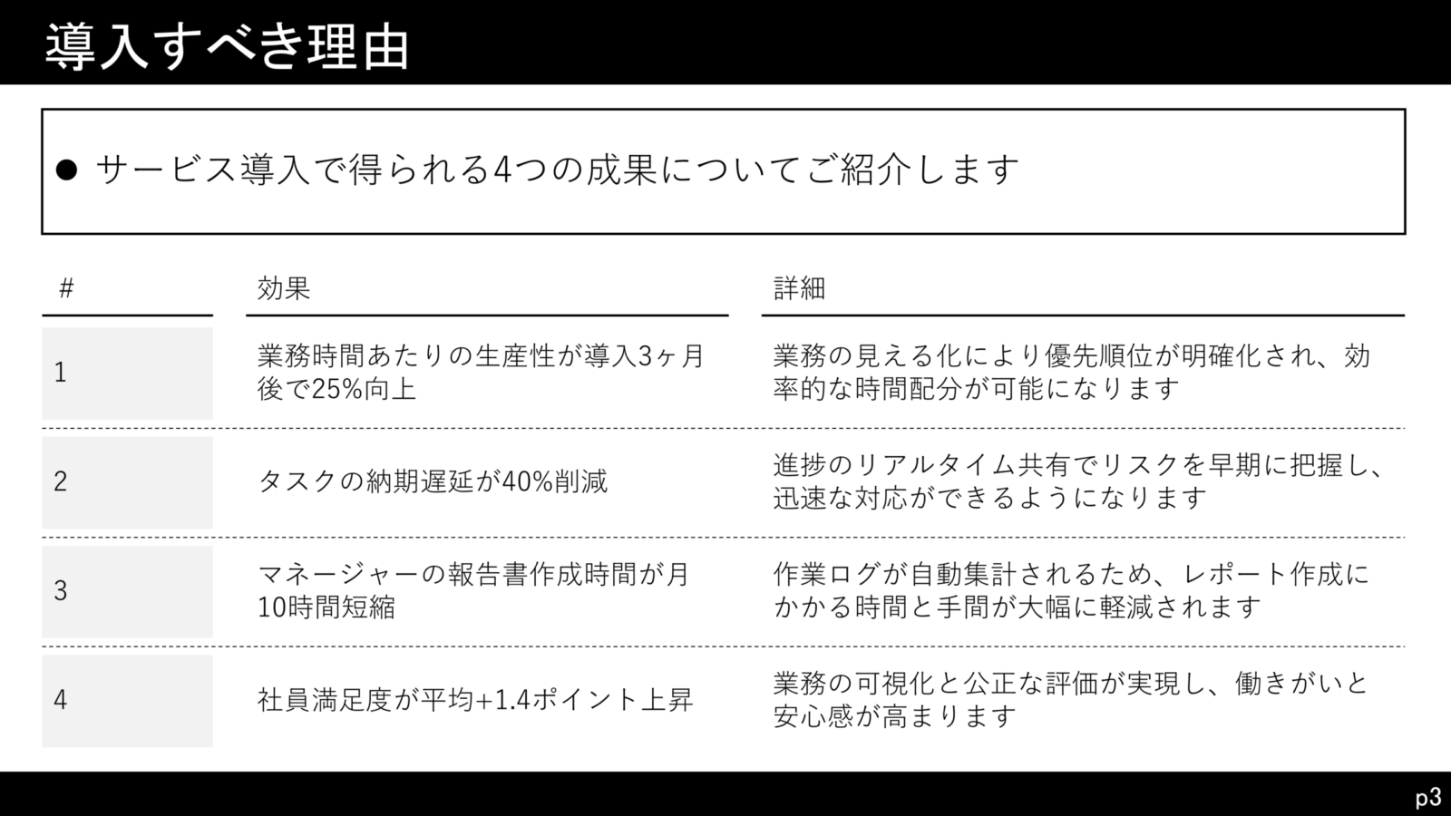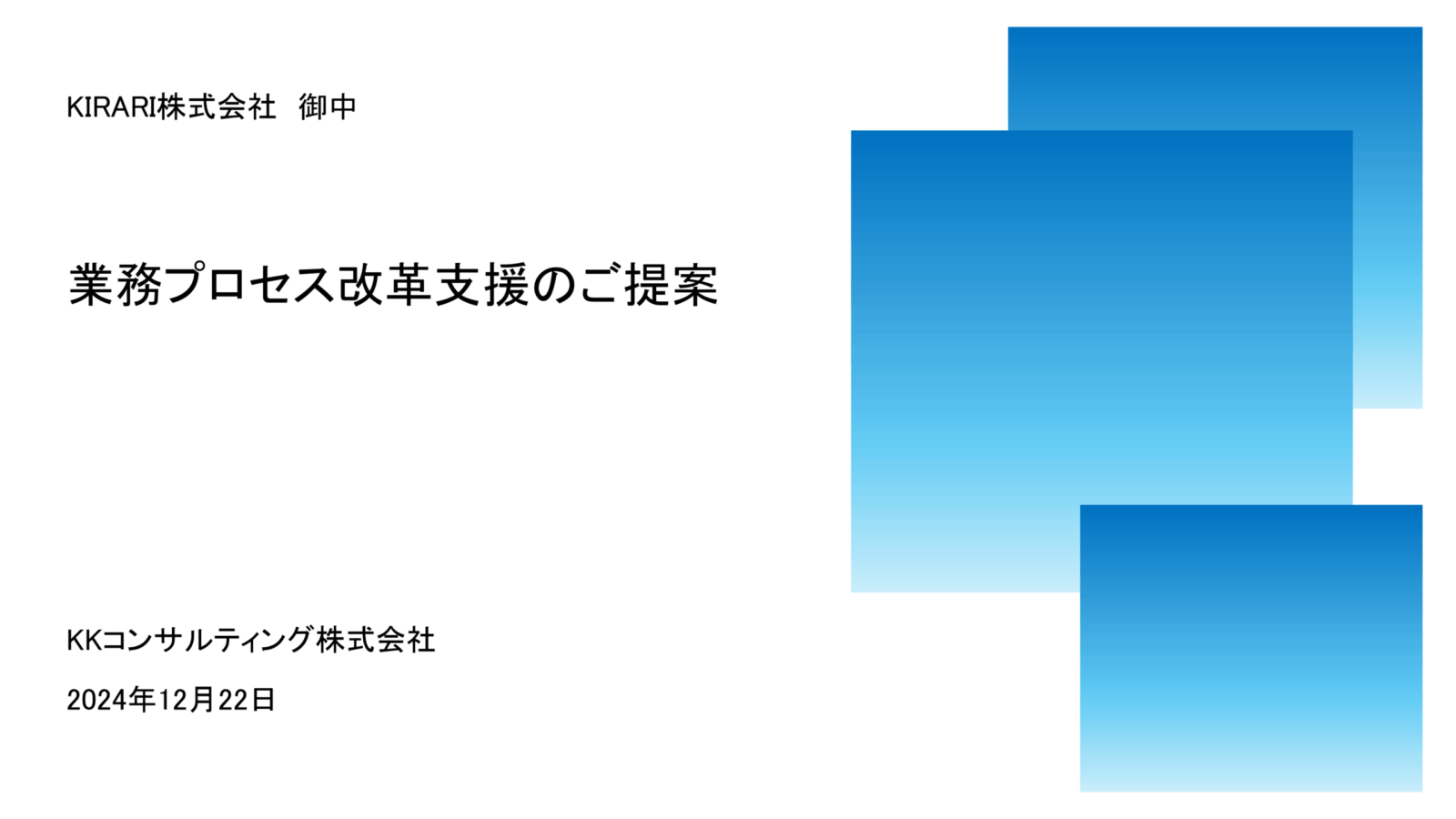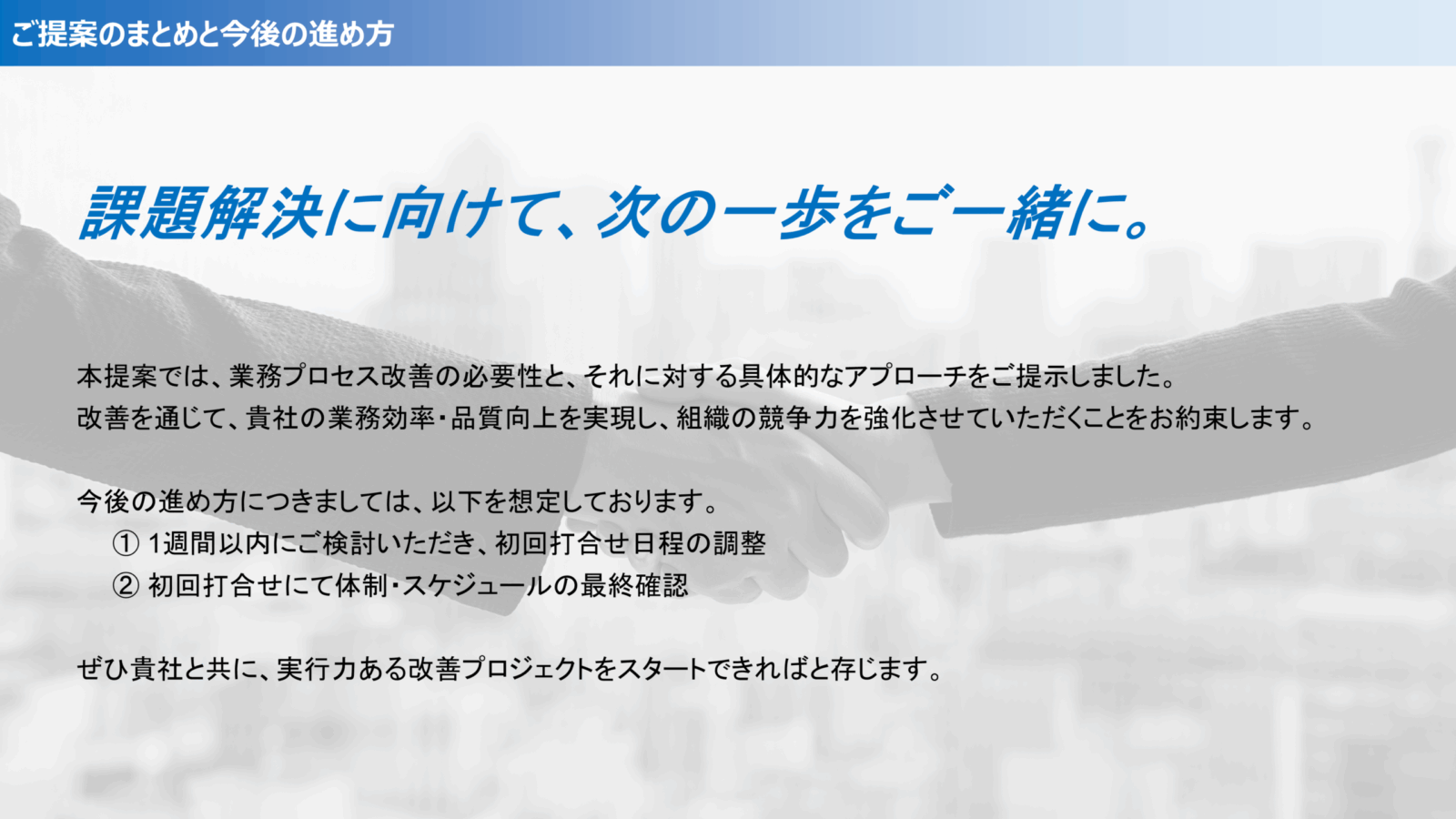 合意した構成・文章に基づいて、数枚のスライドを作成させていただきます。