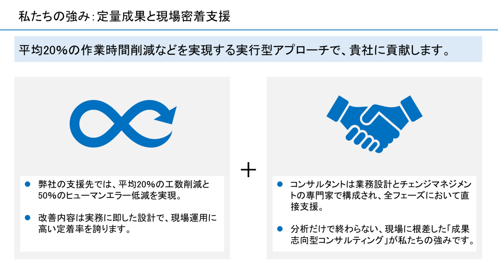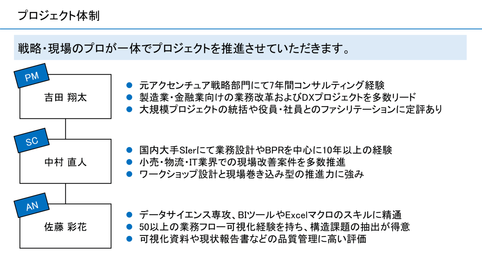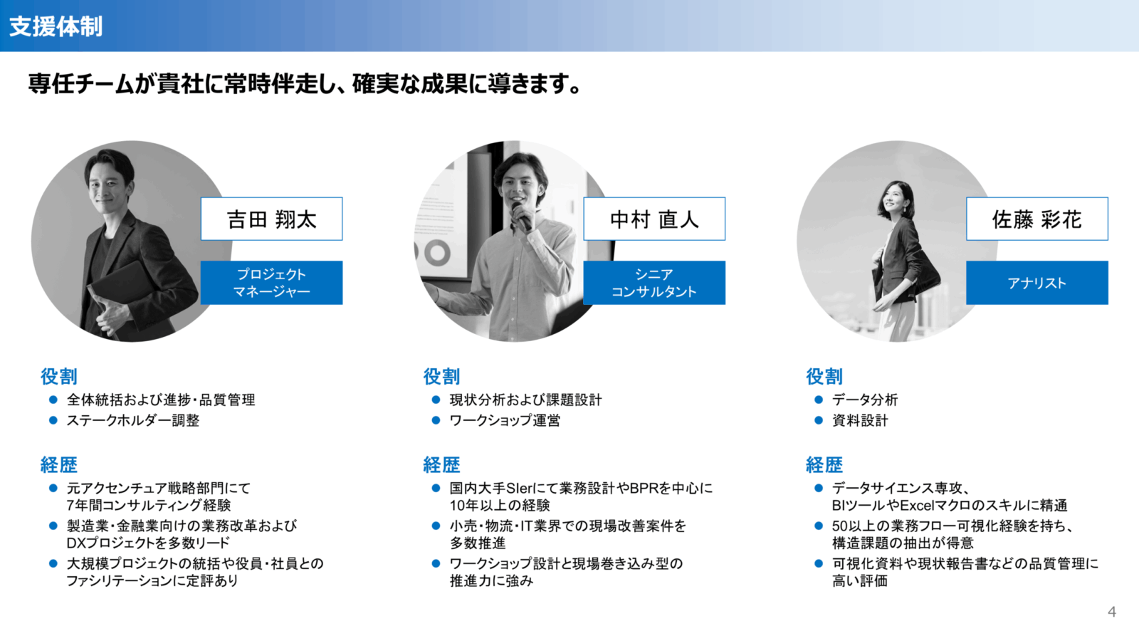 外資戦略コンサルからデザイナーまで在籍しているため、ビジネスの文脈を理解した美しい資料を作成できます