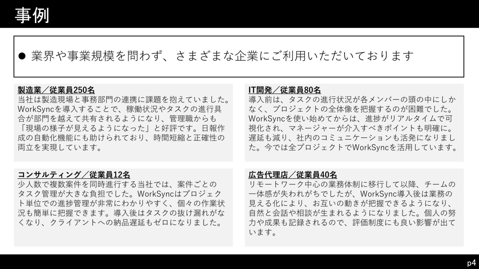 わたしたちは、スタートアップから大企業まで、幅広いお客さまの資料作成をお手伝いしているプロ集団です。