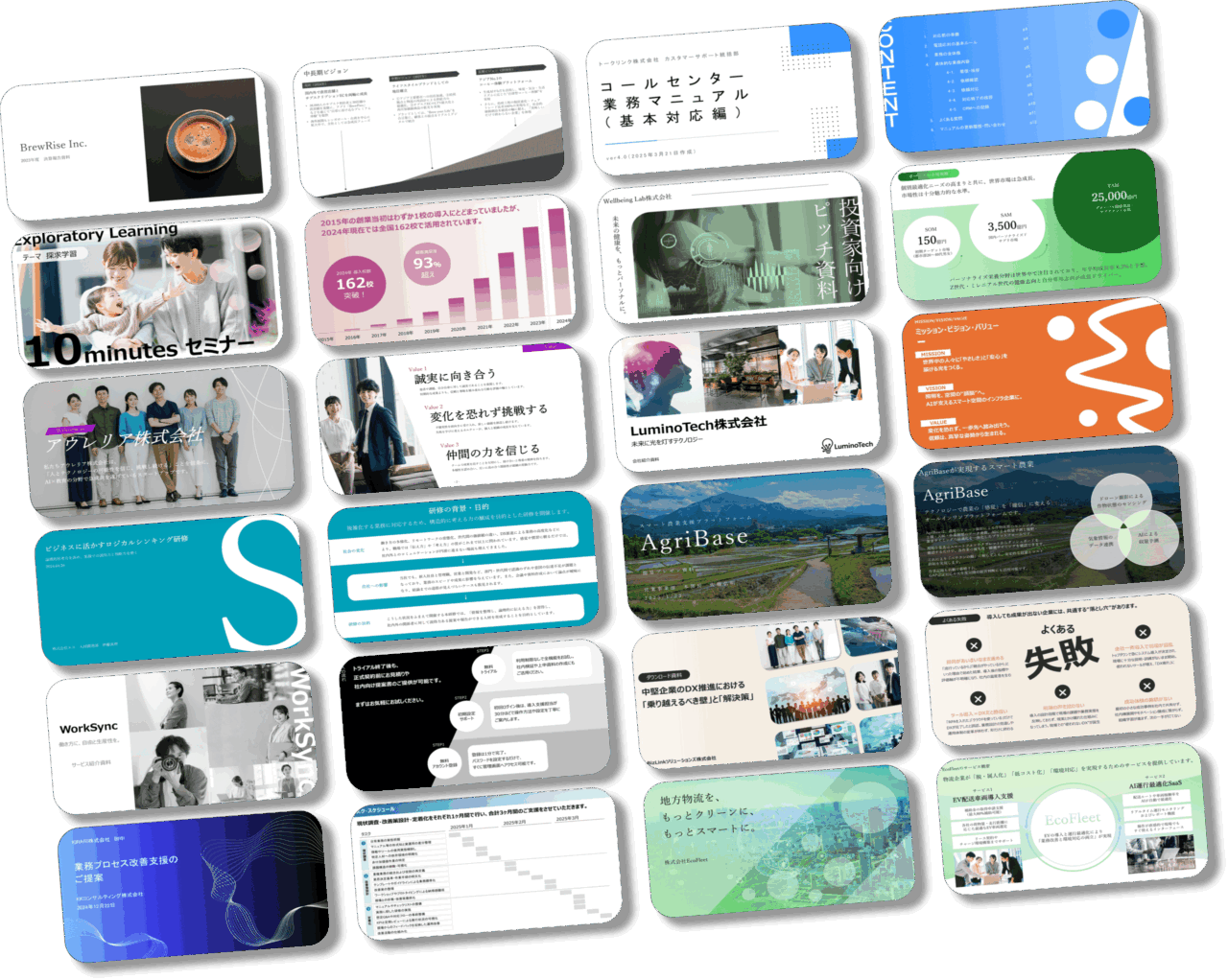 プレゼン資料/営業資料/サービス紹介資料/提案資料/会社紹介資料/セミナー資料/ホワイトペーパーなど、あらゆる資料を作成可能です。
