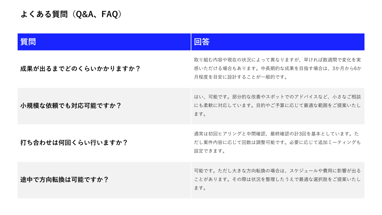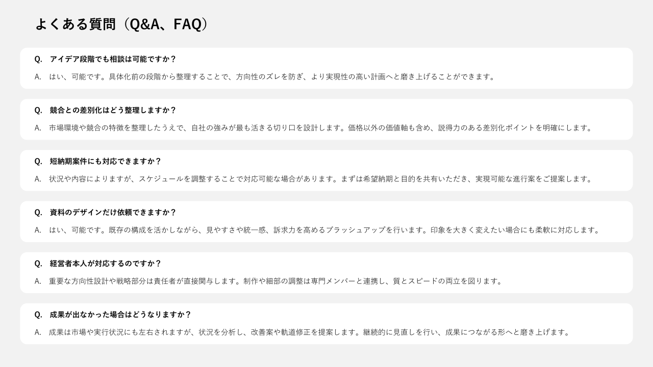 フォントサイズ、色、枠線の太さ、配置間隔などに一貫性があるだけで、資料の完成度は大きく向上します。統一感は信頼感に直結するため、一体感のあるデザインになるようにしてください。