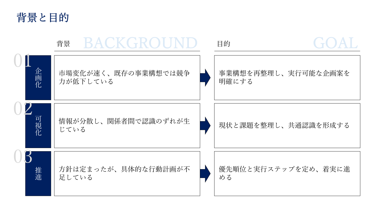 左右で情報を配置し、そのうえで矢印などでつなげると、一目見るだけで対応関係を理解することができます。背景と目的、背景と課題、課題と解決策など、あらゆる場面で活躍する図解デザインです。