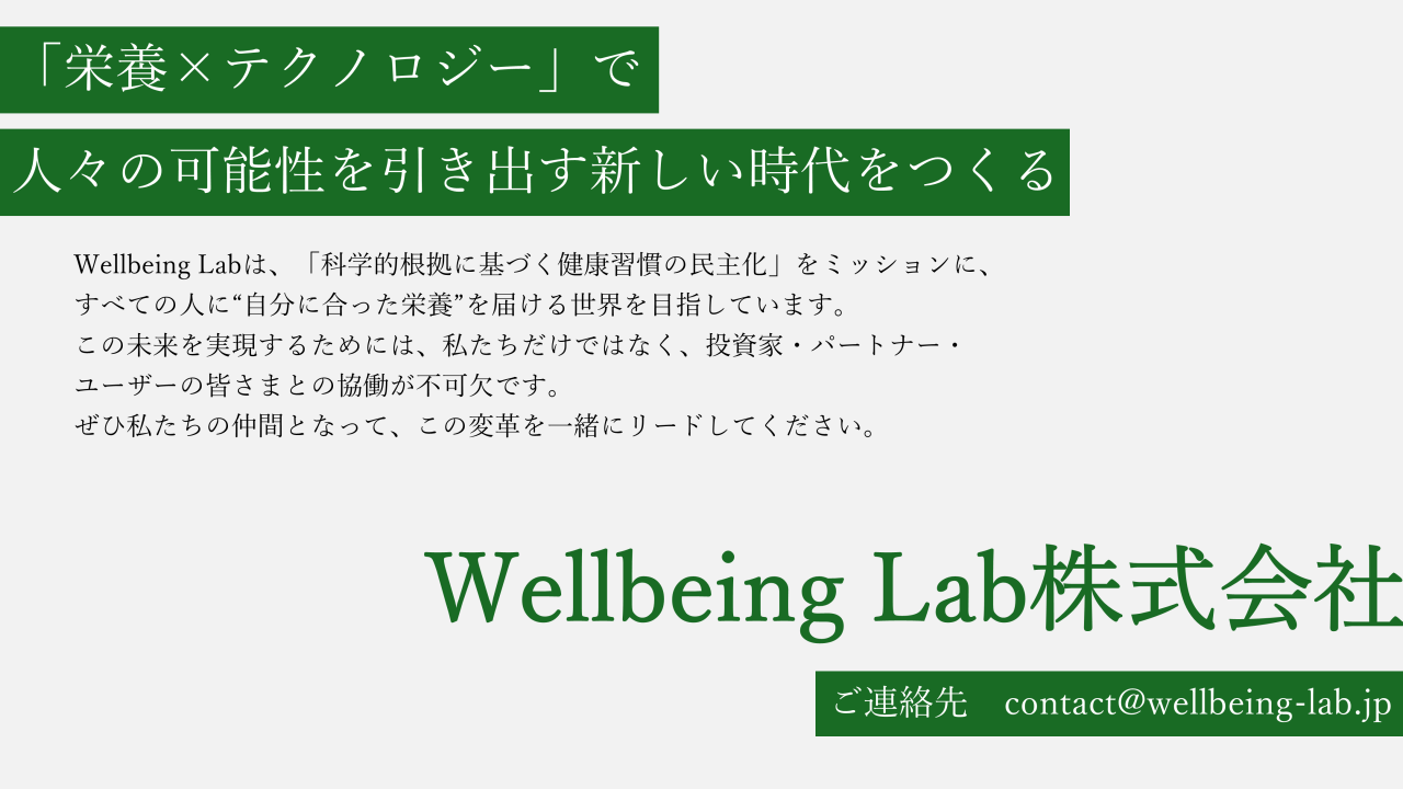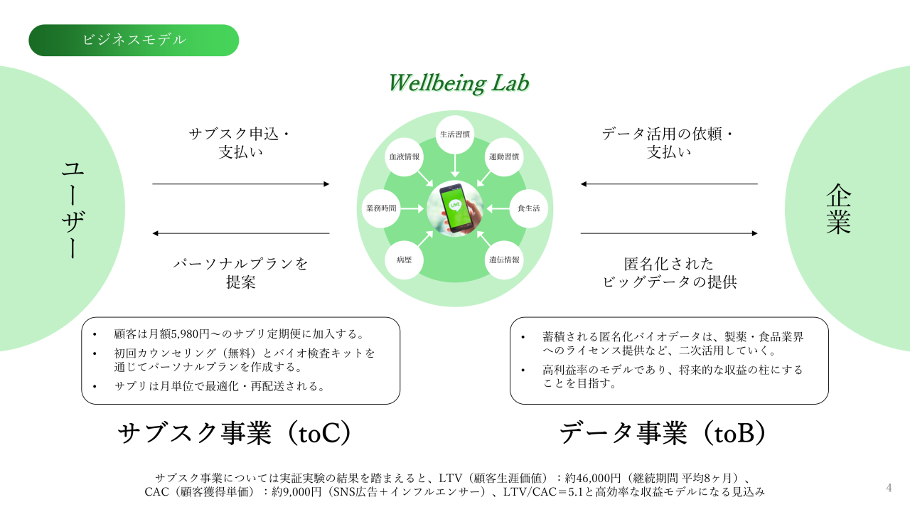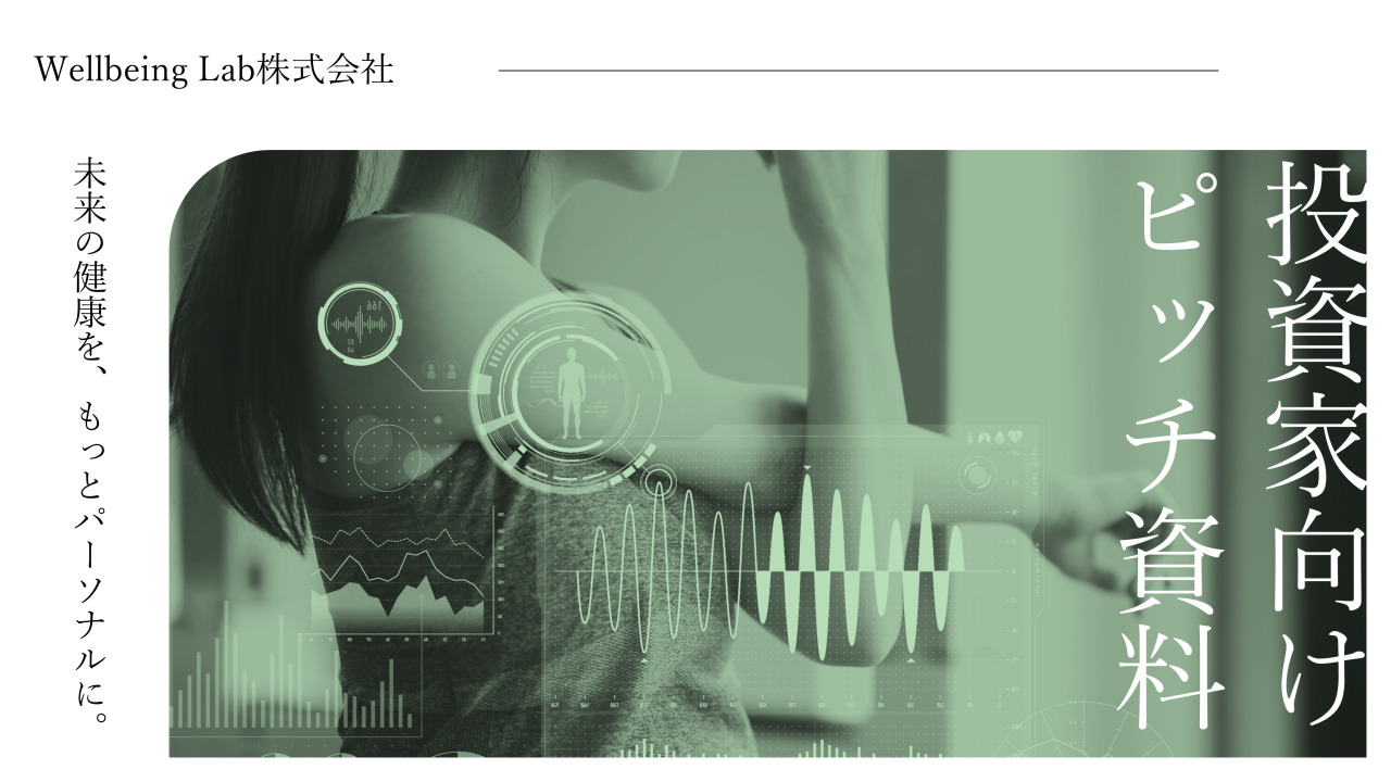 こちらはAIを活用した健康増進サービスを提供する「Wellbeing Lab」のピッチ資料です。