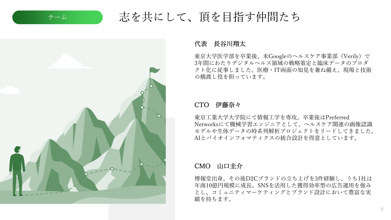 この章では、イメージをもう一段階深めるために、先ほどご説明したAIヘルスケアテック「Wellbeing Lab」のピッチ資料を活用して、各スライドの中身に踏み込んでいきましょう。