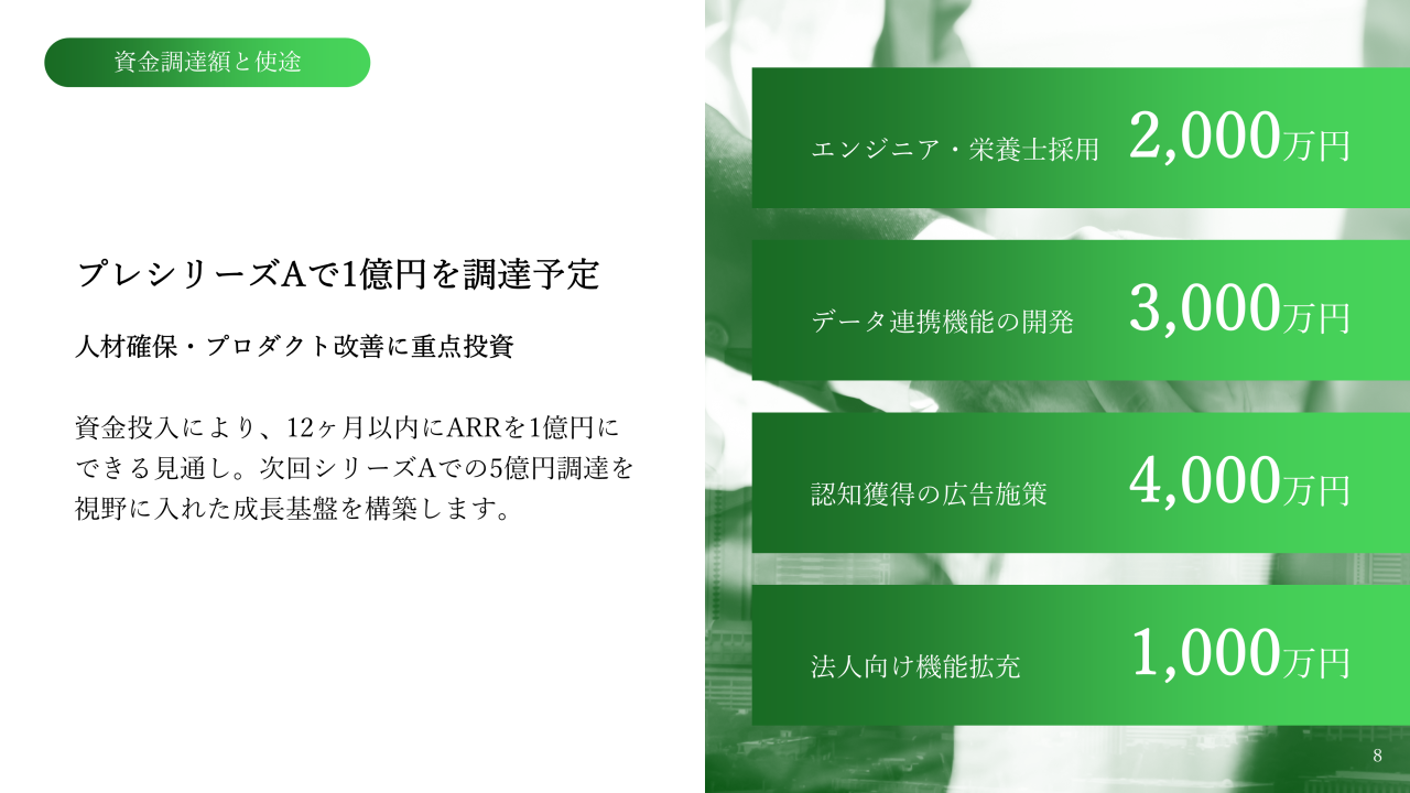 ピッチ資料サンプル9:資金調達額と使途