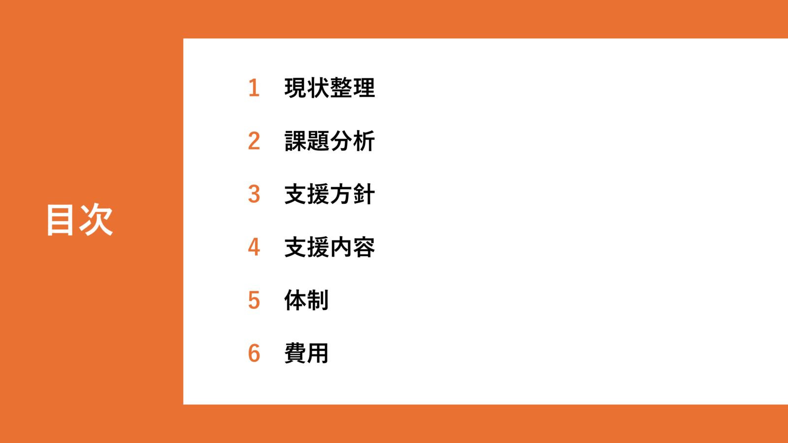 落ち着いたレイアウトで構成された目次ページです。読み手が流れを理解しやすく、ビジネス資料でも使いやすいデザインです。