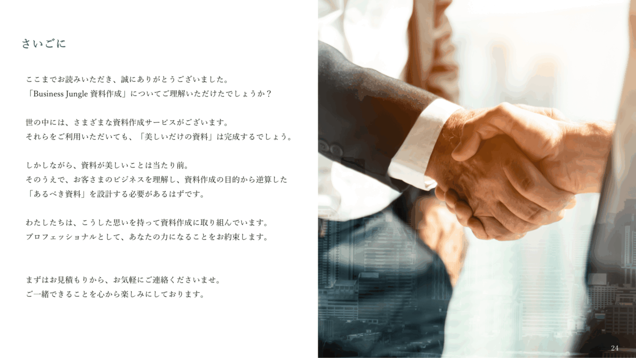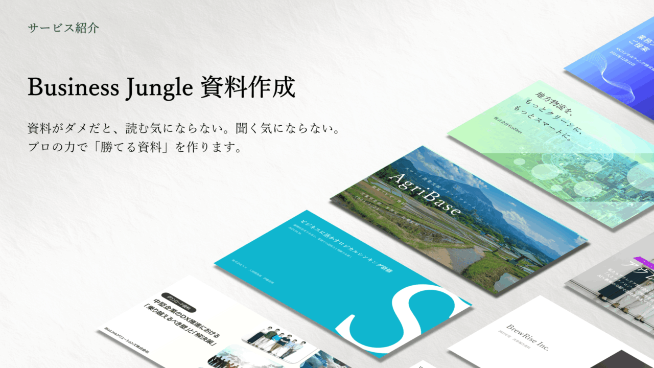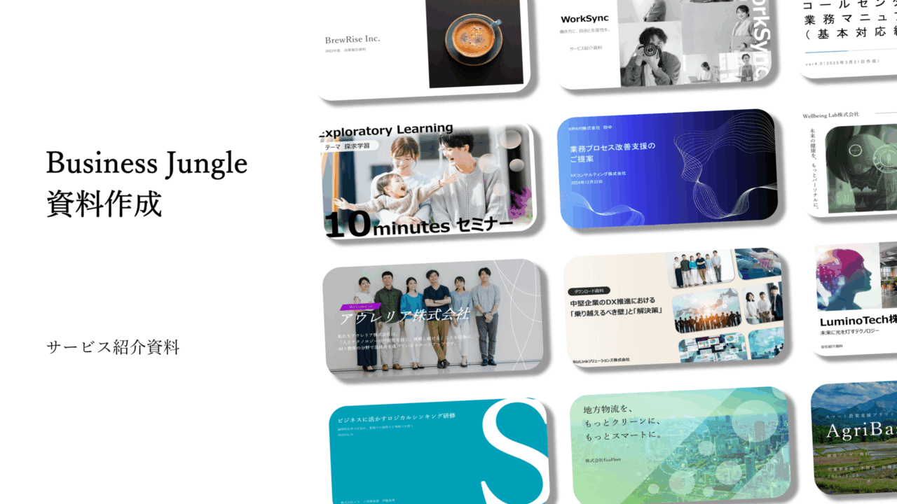 下記フォームに必要事項を記入いただくことで、 すぐに「Business Jungle 資料作成」のサービス紹介資料をダウンロードいただけます。