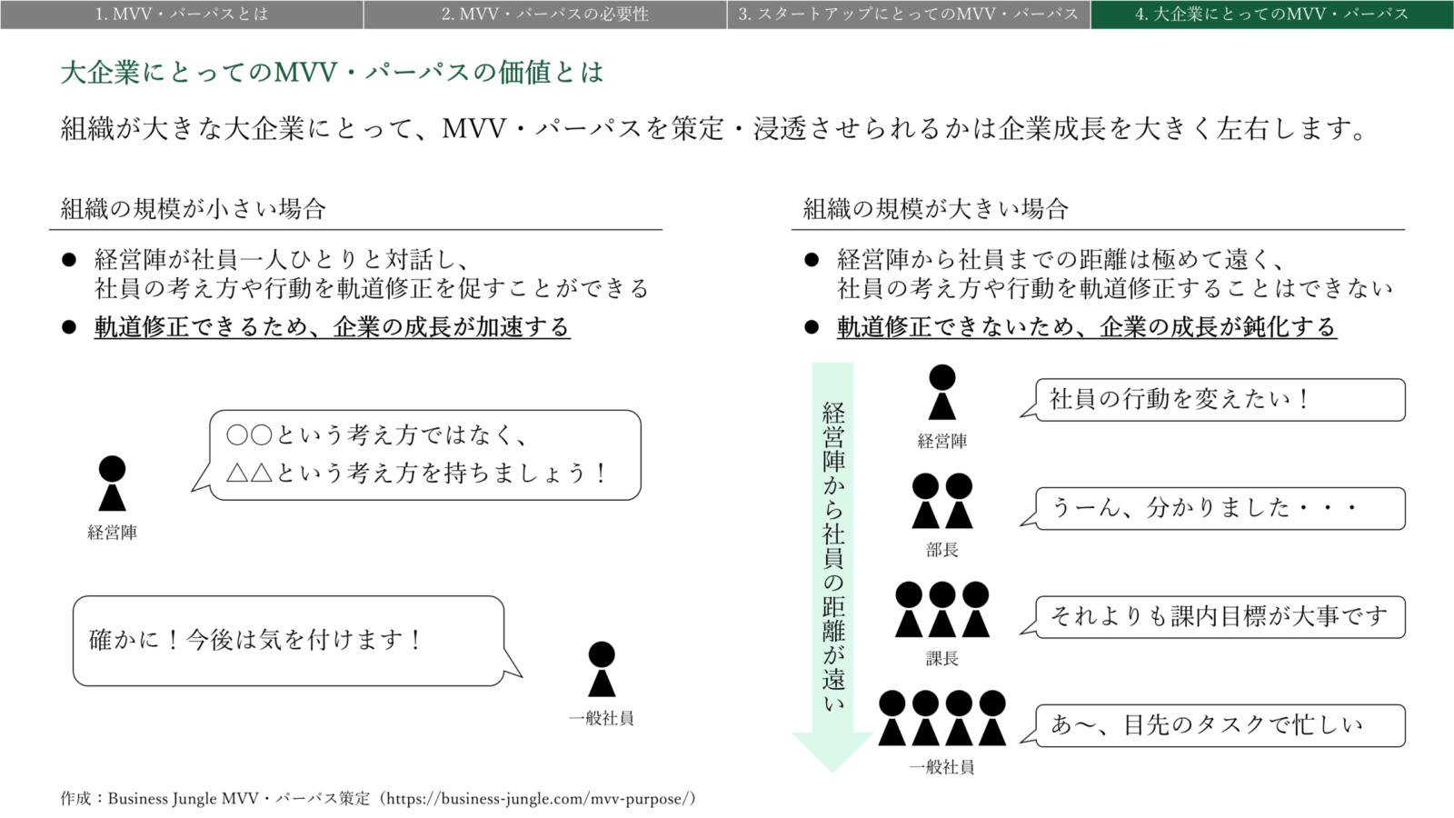 MVV・パーパスはどのような企業においても大切。まだ十分に組織化されていないスタートアップから、既存MVV・パーパスの浸透・刷新を願う大企業まで、Business Jungleは最適なアプローチを提供します。