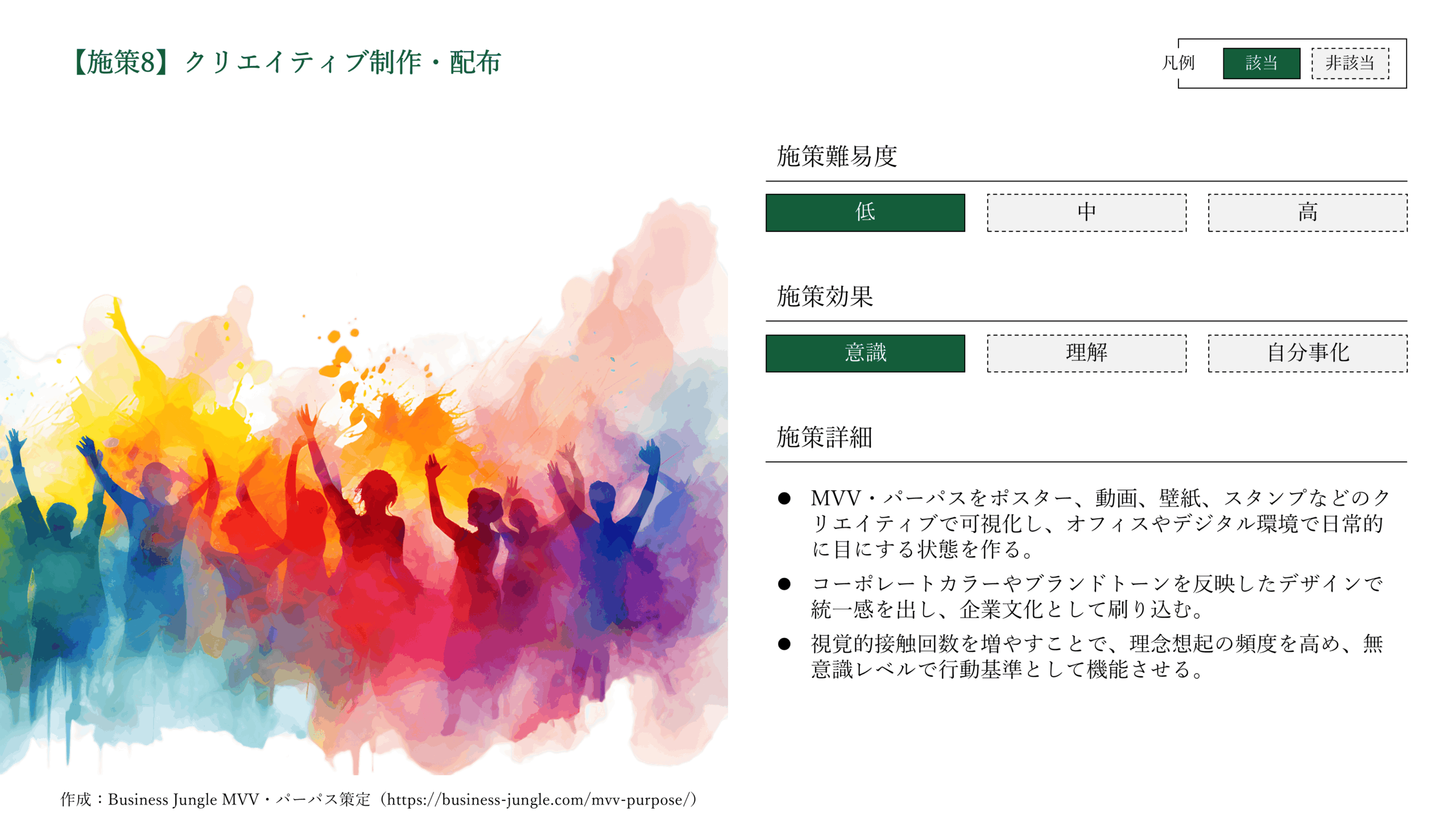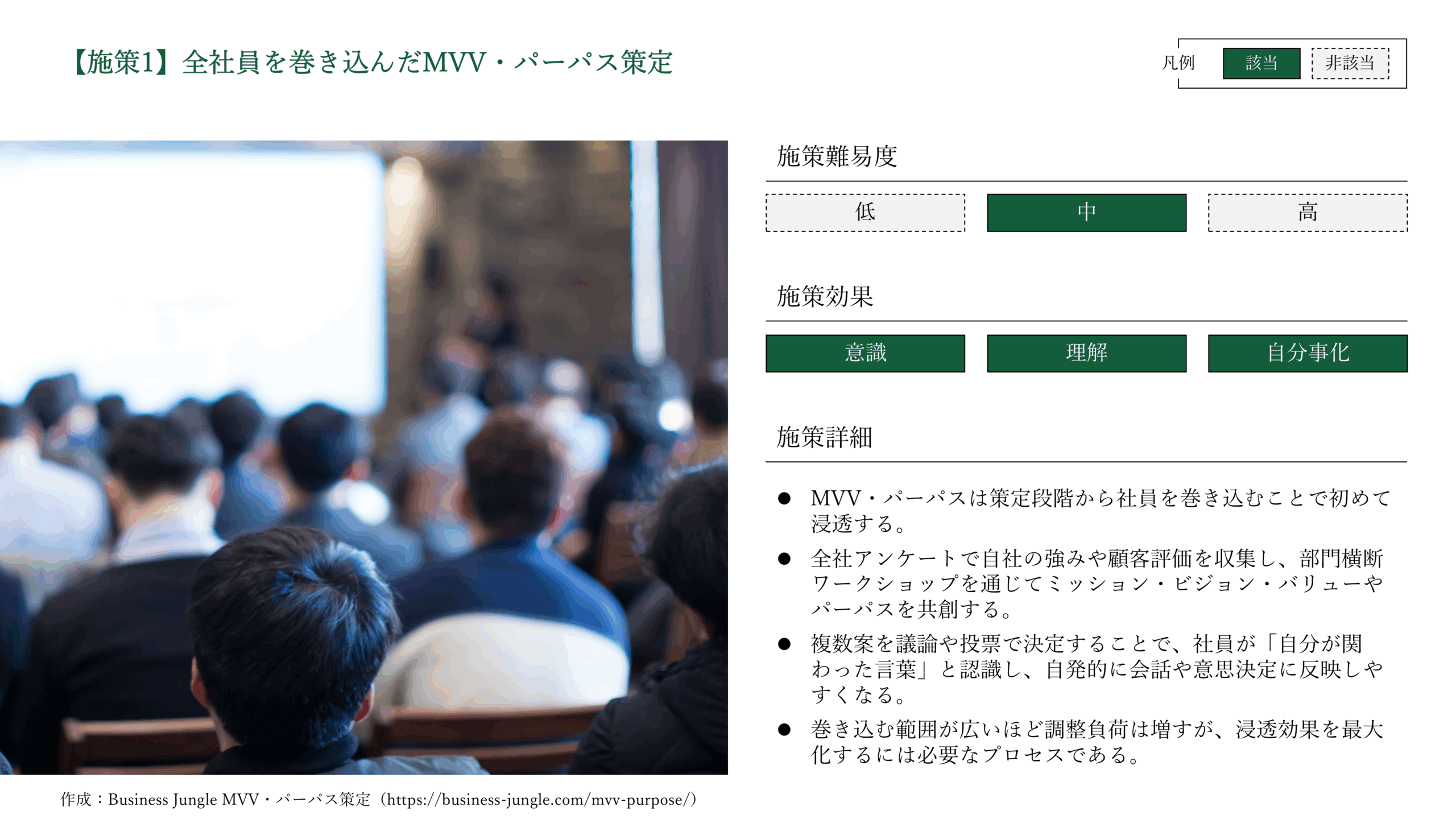 MVV・パーパスは「作って終わり」ではまったく意味がなく、害悪とすら言えます。最も重要なことは、作った内容を社員に意識させ、理解してもらい、自分事化してもらい、そして行動を変えてもらうこと。