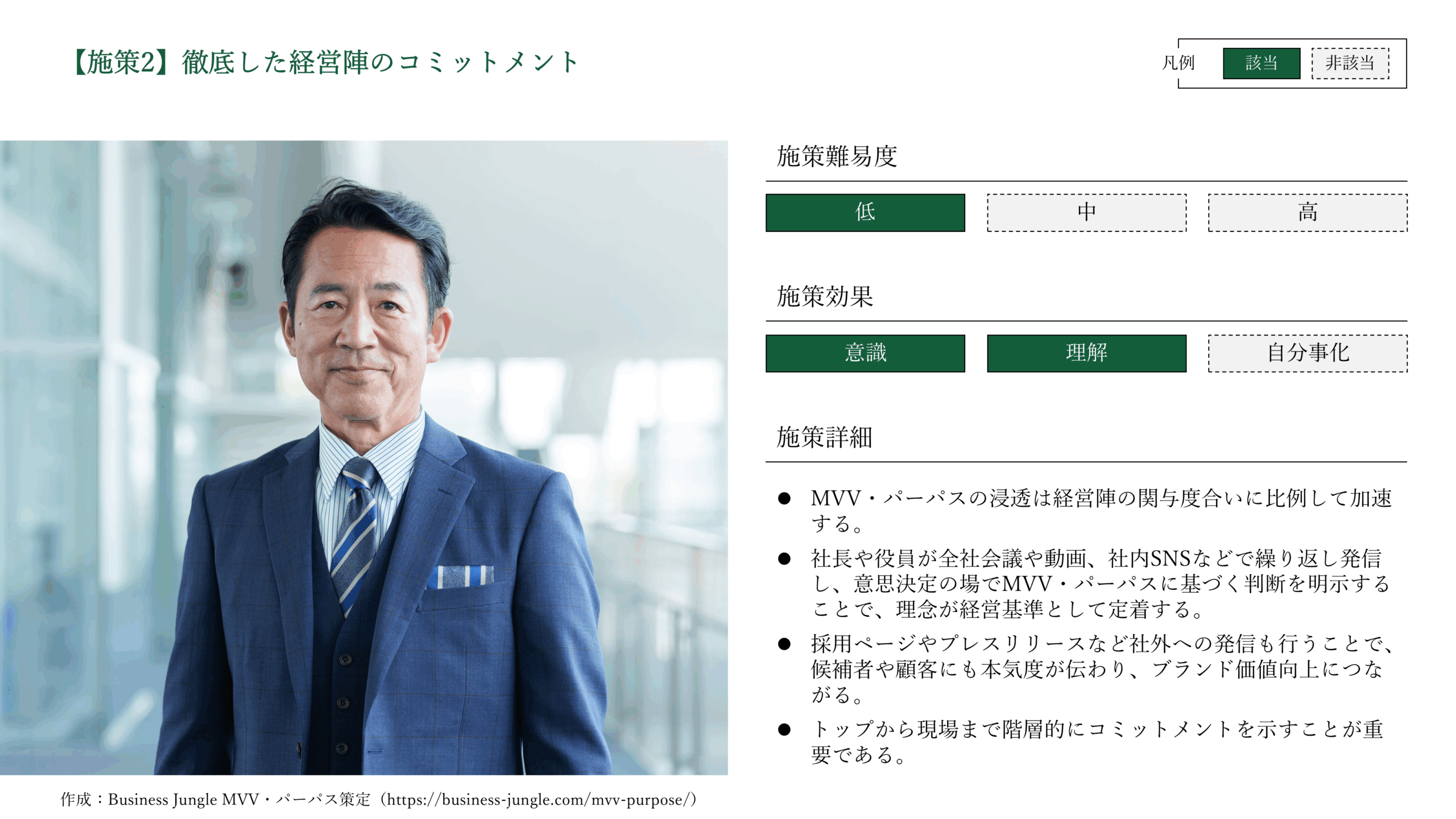 MVV・パーパスの浸透は、経営陣のコミットメントが強ければ強いほど加速します。