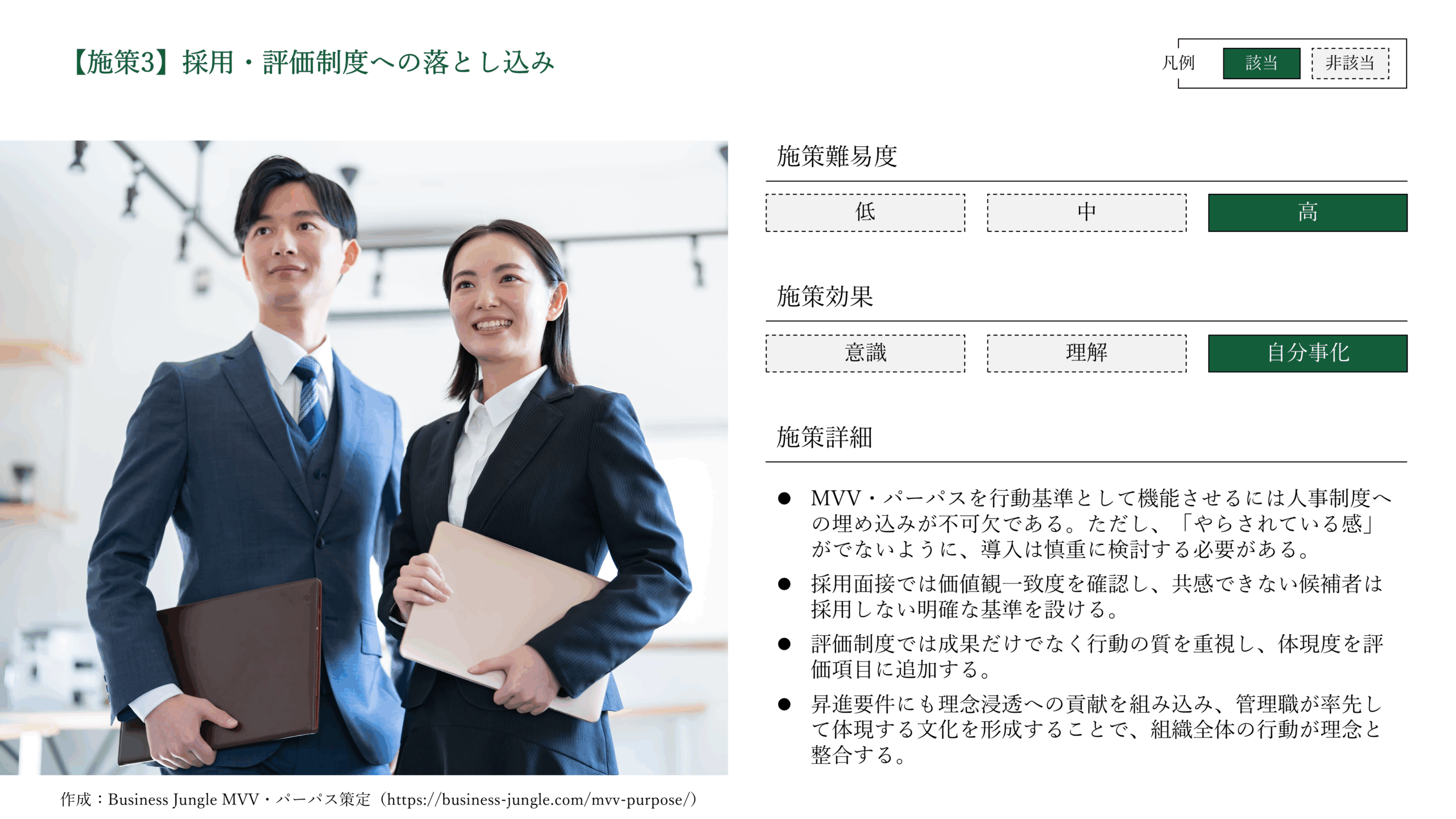 採用面接では候補者が自社のMVV・パーパスに共感できるかを確認し、共感できない候補者は採用しないという判断基準を明確にします。さらに、評価制度では成果だけでなく行動の質を重視し、MVV・パーパスの体現度を評価項目に加えます。昇進条件にも理念浸透の推進や体現が含まれると、社員は理念を日常的に意識するようになります。