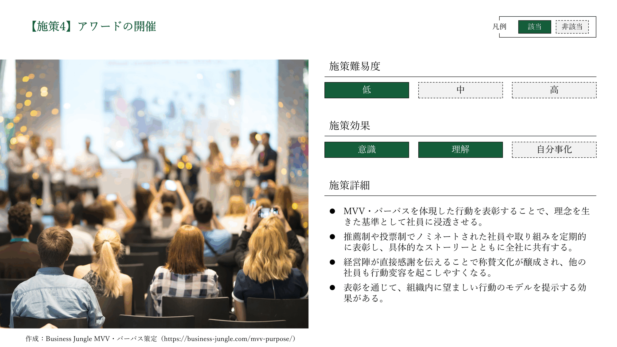 MVV・パーパスを体現した行動を称えるアワードを定期的に開催することは、MVV・パーパス浸透の大きな力になります。