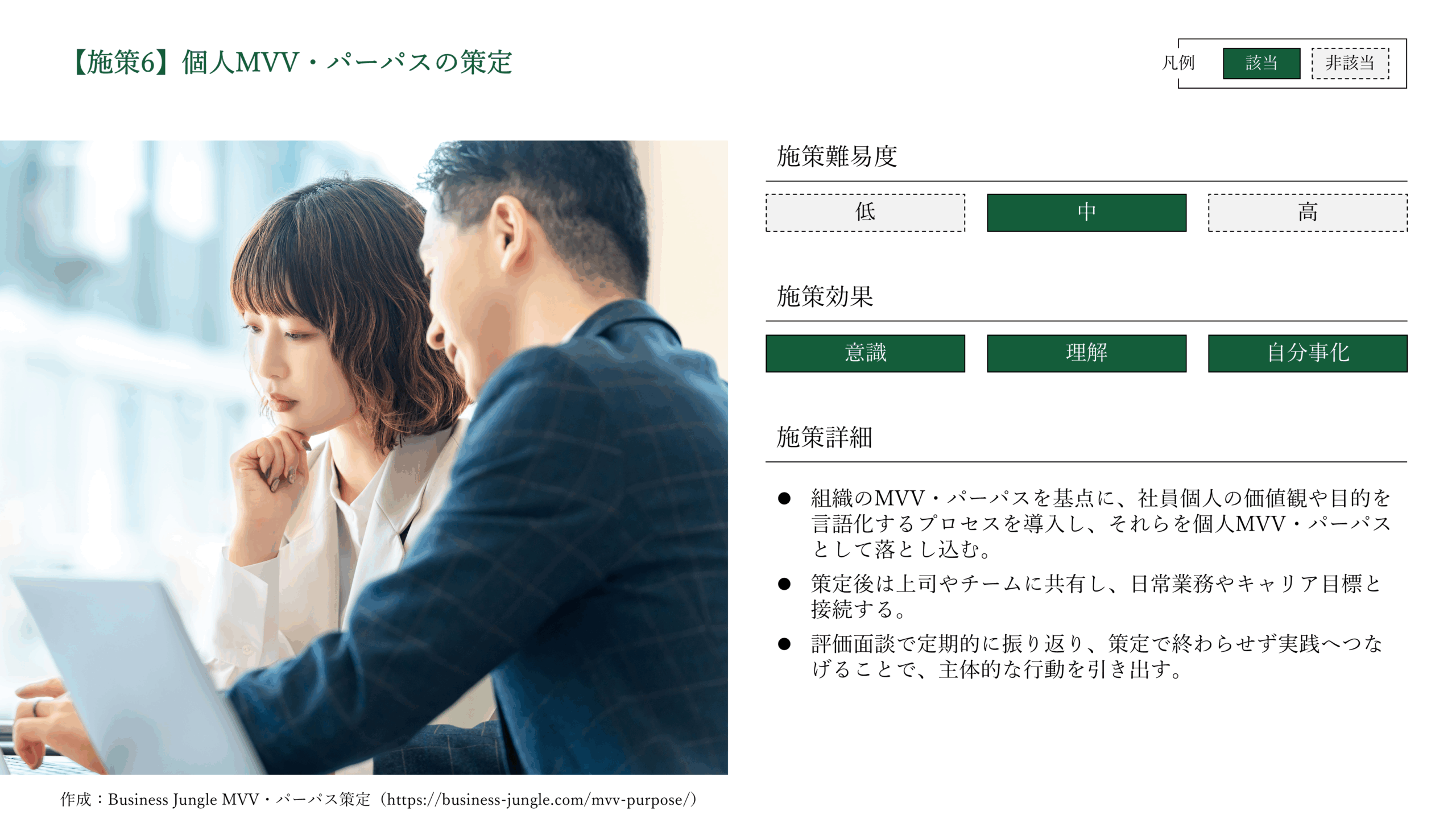 まずは会社のMVV・パーパスを振り返り、自分のキャリアや人生の目標と照らし合わせる時間を設け、「自社のMVV・パーパスと自分のやっていること/やりたいことがどのように重なるか」を考えます。そのうえで、個人MVV・パーパスとしてまとめあげ、日々の業務で意識・実践してもらいます。