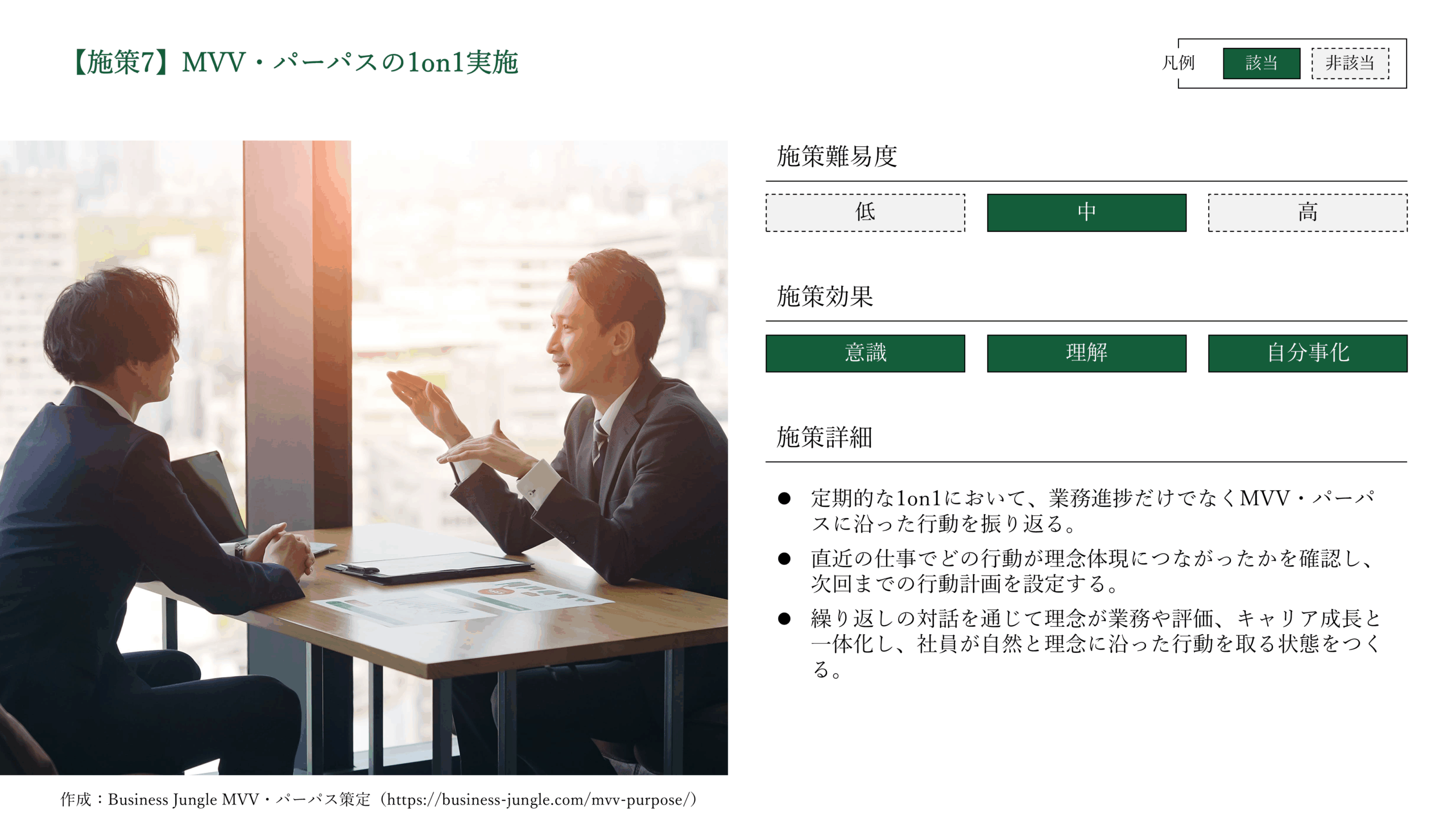 マネージャーと部下の1on1において、単なる業務進捗や評価の話だけでなく、MVV・パーパスを軸とした振り返りを行うと、日常業務での実践が習慣化します。