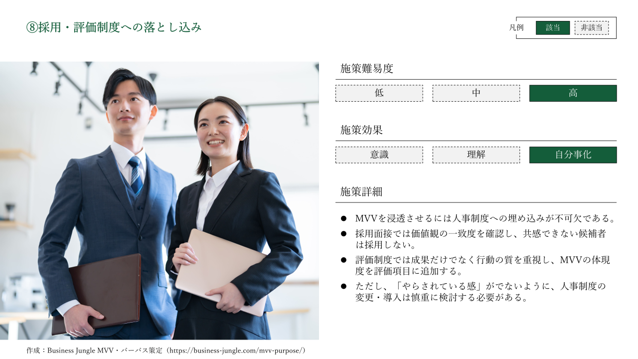 このように、制度と連動させることで、社員がMVVを強く自分事化する仕組みが整います。