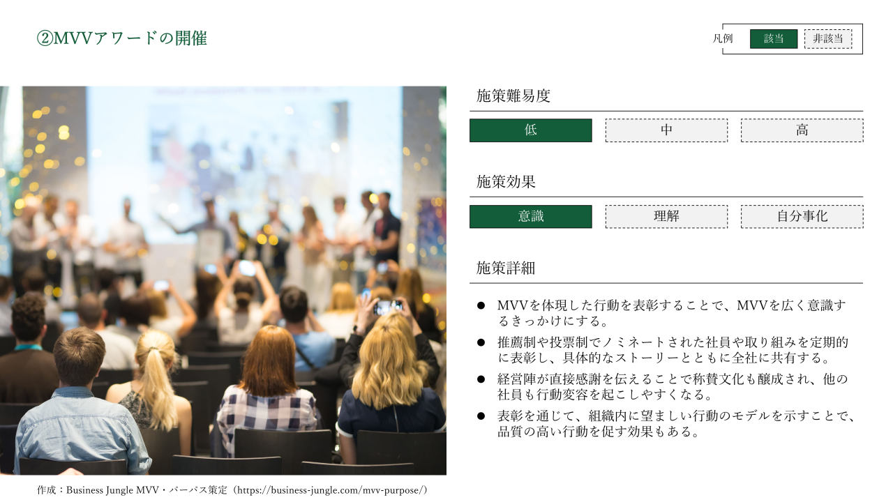 MVVを体現した行動を称えるアワードを定期的に開催することは、MVV浸透にとって大きな追い風となります。